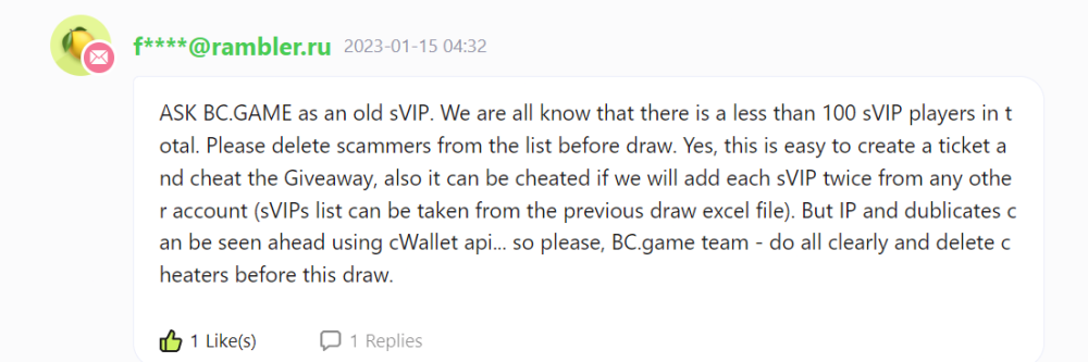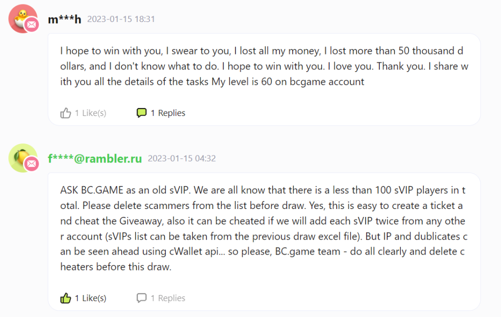 3. Dear BC.GAME Team, the second before this one comment (with a pink circle duck in, from m*h 01-15 18:31 is a clear proof of my words. The verify sVIP system in this draw is sucks. We can see users with 60 level (less than 70) are already jumped in Participants list (if they dont, they wont be able to leave a comment). So please look at it, and cleare Participants list before the draw. Only in such a way sVIPs will believe in transparent winners choise and their winning chanse. Please hear me!