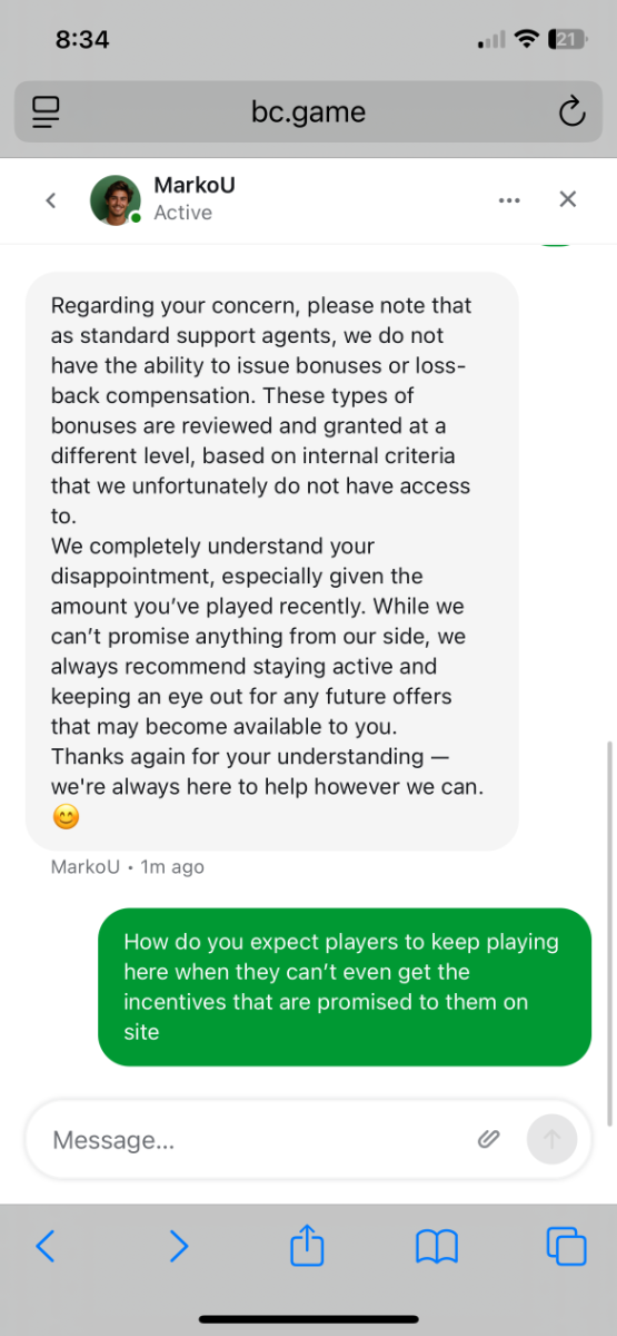 1. I saw another players post in feedback and I couldn’t have related more with this other player. The same thing is happening to him as what it happening to me. So my replay was this. This same thing happened to me. I also have been with BC.Game for 4 years. I’m VIP 60 with 4k xp left to level up to VIP 61. I haven’t had the easiest time lately being able to wager or anything on bc.game. i got a notification about how my vip host services are going to be stopping. Due to not playing as much. Which is not fair. Considering the loyalty I have provided Bc.Game and how much I have actually deposited there. I earned the right to have my vip host a long while ago. It is part of the advantages of being loyal and raising to the level that I am now with VIP. on July 1st, (my birthday) I asked support about being able to get a birthday bonus and they told me no and that I no longer have vip host services. Which is so wrong, on multiple levels. A vip host is part of the rewards you get for playing at bc.game, which I 100% put in the time, money and work to be able to have these rewards. since they took away my host. I didn’t get a birthday bonus like I would normally. I used to get little bonuses here and there as an incentive to keep on playing at bc.game. Which honestly was awesome. But now… I get nothing. I’ve even deposited quite a bit lately and I don’t even get any lossback of the deposits that I have lost. Like what is the point of playing at bc game anymore. There is no incentives on playing there anymore. It’s such a shame. Truly.