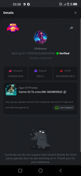 Golden Dancing Lion x 177.2 Betting ID: 1724947781266571904 Hit the Gold! x 44.8 Betting ID: 1724948222505448576 Tiger Jungle x 93 Betting ID: 1725143498319811079 Solar Queen x 47 Betting ID: 1725006049288958592